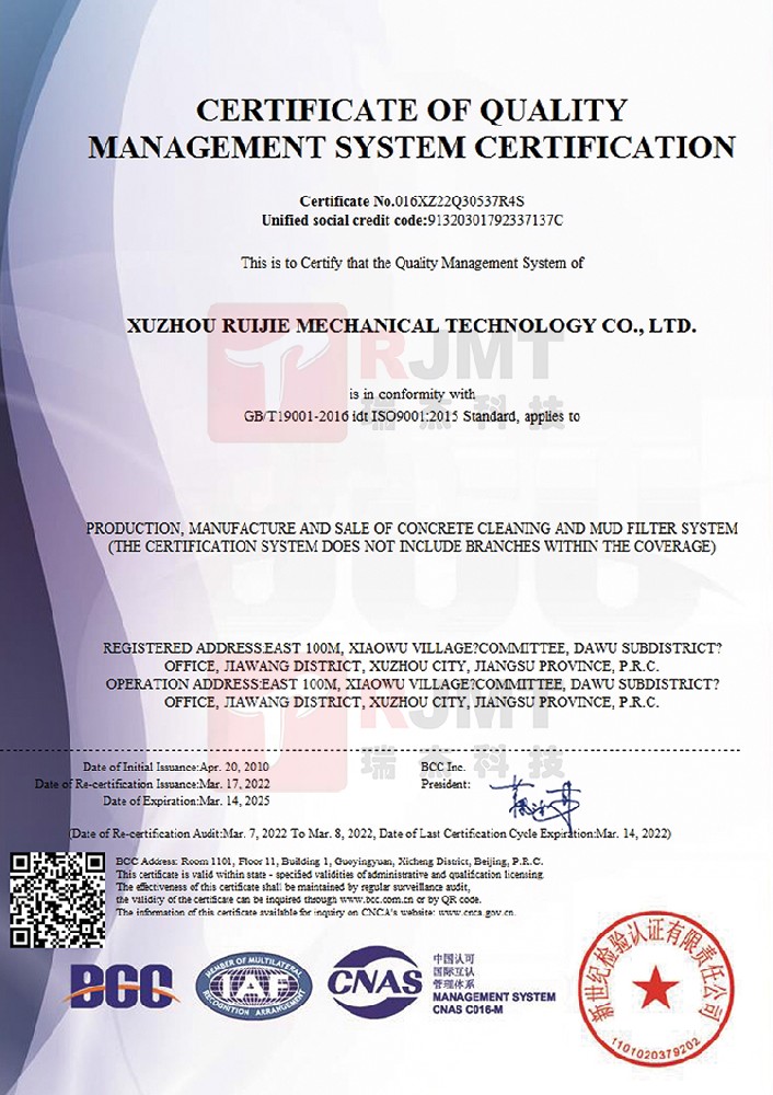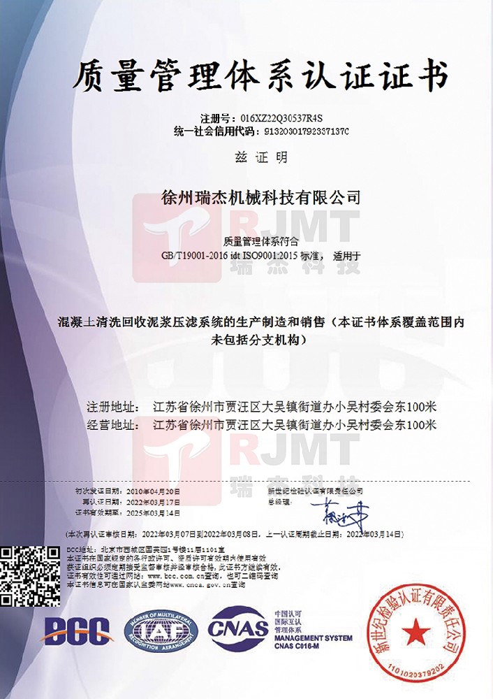 公司RJK系列混凝土清洗、污水回收以及泥浆压滤系列产品在国内率先同时获得ISO9001:2008国际质量管理体系认证(BCC)证书...+ MORE